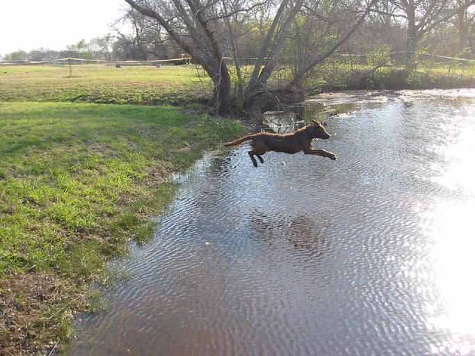 Keywords: Young chessie.JPG A young Chesapeake Bay Retriever in training own 2006-04-14 Patparks Chesapeake Bay Retriever Dogs in water Jumping dogs