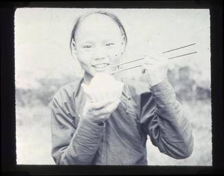 “Rice, anyone?” A young Chinese person is eating a bowl of rice with chopsticks, Changteh [now Changde], Hunan, China.; Captions for this set of lantern slides from the papers of Oliver and Jennie Logan, American Presbyterian missionaries in Hunan, were provided by their daughter Elsa.