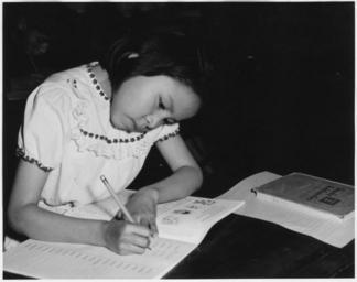 | Keywords: Young female day school student concentrating on spelling work book - NARA - 295169.jpg Scope and content General notes 295169 Local identifier Department of the Interior Bureau of Indian Affairs Navajo Area Office - NARA's Pacific Region Riverside NRHAR 23123 Cajalco Rd Perris CA 92570 Record group Record Group 75 Records of the Bureau of Indian Affairs 1793 - 1999 Record group ARC 404 Central Classified Files compiled 1924 - 1954 Series ARC 295145 File unit 48 1 Photos ca 1940 - ca 1940 File unit ARC 295146 Variant control numbers NAIL Control Number NRHL-75-NAOCCF-PHOTOS-GOF23<br /> Other Identifier Central Classified Files Box 39 Other versions <gallery> File Young_female_day_school_student_concentrating_on_spelling_work_book_-_NARA_-_295169 tif tif </gallery> NARA-cooperation PD-USGov Historical photographs of Navajo people Black and white photographic portraits of children Learning People and desks People with black background Females writing Girls facing right Concentration Exercise book People with writing tools |