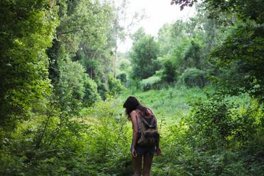 Keywords: young girl long hair brunette backpack knapsack jean shorts tank top grass trees people nature