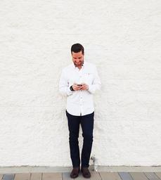 Keywords: young man looking at phone brick wall white wall mobile smart phone young male man adult standing text technology white smiling charming cheerful expression classic confidence