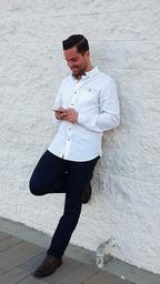 Keywords: young man standing brick wall white brick wall han handsome hair men person smiling posing street style man people casual caucasian lifestyle adult attractive fashion portrait charming confidence elegance leaning male young brick wall