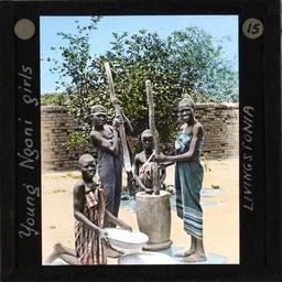 | Keywords: "Young Ngoni girls, Livingstonia", Malawi, ca.1910 (imp-cswc-GB-237-CSWC47-LS4-1-015).jpg en <br> Young Ngoni girls Livingstonia Malawi ca 1910 Photograph of 4 young Ngoni girls grinding flour in a large mortar and pestle The girls are wearing colourful robes and there is a red brick wall in the background The Ngoni people are an ethnic group living in Malawi Mozambique Tanzania and Zambia in east-central Africa The Ngoni trace their origins to the Zulu people of kwaZulu-Natal in South Africa ; This belongs to a series of Church of Scotland Foreign Missions Committee lantern slides relating to Rev Donald Fraser 1870-1933 Rev Donald Fraser the Scottish missionary was born in Argyllshire Scotland the son of a Free Church minister In his youth Rev Fraser helped found the Student Volunteer Movement in Britain and the World Student Christian Federation before beginning missionary service in Malawi with the Free Church of Scotland He worked in Malawi from 1896 until he returned to Scotland in 1925 He was first posted to Ekwendeni and later Embangweni Rev Fraser worked closely with the Ngoni people Photographer Unknown Filename imp-cswc-GB-237-CSWC47-LS4-1-015 tif Coverage date circa 1910 Part of collection International Mission Photography Archive ca 1860-ca 1960 Type images Part of subcollection Photographs from the Centre for the Study of World Christianity University of Edinburgh U K ca 1900-ca 1940s Repository name Centre for the Study of World Christianity Archival file impaunpub_Volume7/1464 url Repository address The University of Edinburgh School of Divinity New College Mound Place Edinburgh EH1 2LX United Kingdom Geographic subject country Malawi Format aacr2 1 lantern slide 8 x 8 cm Geographic subject continent Africa Rights Contact the repository for details Part of series Donald Fraser of Loudon LS4/1 Repository email divinity-CSWC ed ac uk Subject lcsh Keyword Women; Village communities Date created circa 1910 Publisher of the digital version University of Southern California Libraries Subject aat genre group portraits Format aat lantern slides Legacy record ID impa-m68512 Access conditions http //www ed ac uk/schools-departments/divinity/research/centres/world-christianity/collections-resources File GB 237 CSWC47/LS4/1/15 1910 author http //digitallibrary usc edu/cdm/ref/collection/p15799coll123/id/64585 PD-old-70-1923 Magic lantern images Images from USC Digital Library uploaded by Fæ International Mission Photography Archive ca 1860-ca 1960 |
