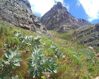 Keywords: Young Waboom trees on Table Mountain - Protea nitida 2.JPG en Field of young Protea nitida plants on the slopes of Table Mountain 2012-02-14 own Abu Shawka cc-zero Uploaded with UploadWizard Protea nitida Peninsula Granite Fynbos