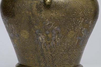 | Keywords: Yunus ibn Yusuf, "al-naqqash al-Mawsili" - Ewer - Walters 54456 - Detail I.jpg In a notable artistic innovation medieval Islamic artisans used precious metals- gold silver and copper- to decorate bronze and brass objects The richly decorated surface of this ewer features multiple bands of Arabic inscriptions and scalloped medallions enclosing musicians enthroned figures hunters and other scenes characteristic of medieval Islamic art The presence of the artist's signature here is noteworthy since the medieval Islamic artisan generally remained anonymous Yunus ibn Yusuf styles himself al-naqqash or decorator probably signifying that he was responsible for executing the inlaid designs He also ends his name al-Mawsili meaning from Mosul a famous metalworking center in northern Iraq However Yunus ibn Yusuf could just as easily have been working in Syria where metal workshops produced similar inlaid vessels during the 13th century between 1246 1247 AH 644 Crusader brass with silver inlay cm 44 5 31 8 16 5 accession number 54 456 22888 Dikran Kelekian New York and Paris Henry Walters city Baltimore Walters Art Museum Henry Walters Acquired by Henry Walters 1917 Signature Yunus ibn Yusuf al-naqqash al Mawsili; Date A H 644; Translation Glory to our lord the sultan the royal Exhibition of Persian Art Iranian Institute New York 1940 Highlights from the Collection The Walters Art Gallery Baltimore 1998-2001 place of origin Mosul Iraq Walters Art Museum license Islamic metalwork in the Walters Art Museum Yunus ibn Yusuf Media contributed by the Walters Art Museum needs category review Brass vessels containers |