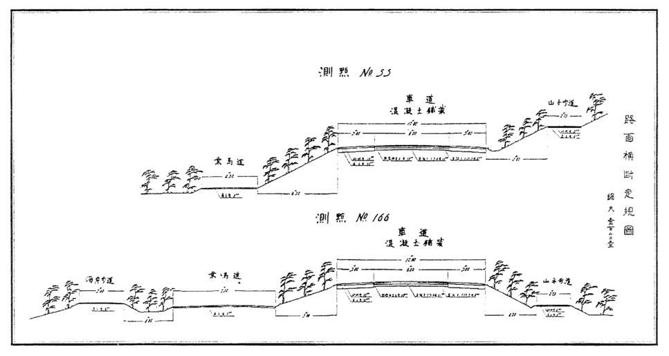 Keywords: Yuuhodanmen.gif ja 神奈 道片 大磯線路 横断定規 (断 図) 神奈 縣 部 直営執行 縣道片 大磯線道路新設工事概要 kurobe56 1936-10-20 PD-Japan Route 134 Japan