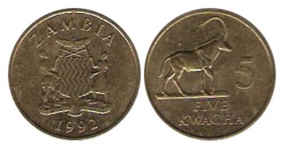Keywords: Zambian 5 kwacha.JPG Zambian 5-kwacha coin 1992 Moneda de cinco kwachas zambianos de 1992 2006-08-26 own assumed B25es Coins_of_Zambia 1992 in Zambia