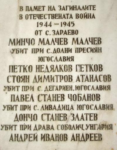 Keywords: Zaraevo zaginali 1944 1945.jpg bg Село За аево община Попово Паметна плоча с имената на загиналите за аевчани п ез Вто ата световна война own Wlado bg Vladimir Stoykov 2008-10-21 Zaraevo War memorials in Bulgaria Monuments and memorials in Targovishte Province |