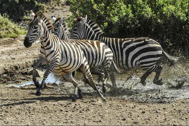 Keywords: zebra running savannah water hole wild mammal stripes serengeti tanzania africa