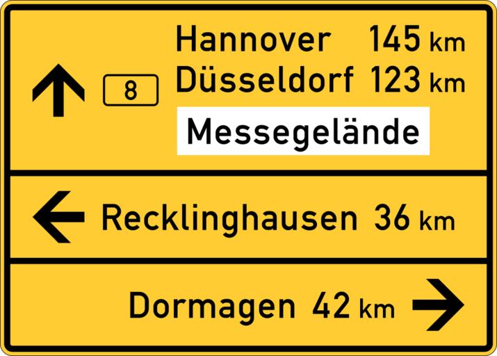 | Keywords: Zeichen 434 - Tabellenwegweiser, StVO 1992.svg Zeichen 434 “ Tabellenwegweiser In dieser Form seit 1992 gebräuchlich Erläuterung aus der StVO 2009 Der Tabellenwegweiser kann auch auf einer Tafel zusammengefaĂźt sein Die Zielangaben in einer Richtung können auch auf separaten Tafeln gezeigt werden Sign No 434 “ combined direction sign Image taken from the de StraĂźenverkehrsordnung German Road Regulations as published by the de Bundesministerium fĂĽr Verkehr Bau- und Wohnungswesen German Federal Ministry of Traffic Building and Housing at http //www bmvbw de/Verkehr/Strasse- 1449/Strassenverkehrs-Ordnung htm own Andreas06 31 Juli 2006 erstes Hochladedatum + Signs In der StVO von 1970 bis 1992 war diese Tafel als Zeichen 436 “ Wegweisertafel “ verzeichnet <gallery> File Zeichen 436 - Wegweisertafel StVO 1970 svg </gallery> PD-GermanGov Cc-zero PD-VzKat Diagrams of direction road signs of Germany 434 svg Diagrams of direction road signs of Germany 1992 set 434 svg Zeichen 434 |