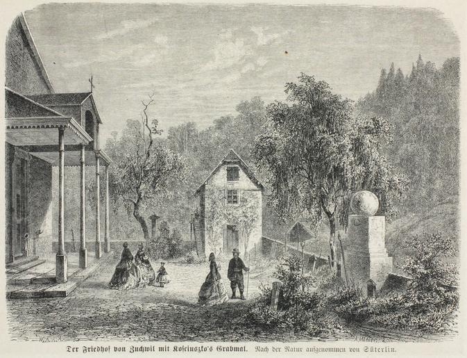 | Keywords: Zentralbibliothek Solothurn - Der Friedhof von Zuchwil mit Kosciuszkos Grabmal Nach der Natur aufgenommen von Süterlin - a1027.tif  Blick auf den Friedhof von Zuchwil mit dem Grabmal Kosciuszkos rechts neben einer Birke ; links die Vorhalle der Friedhofskapelle; ein kleineres Gebäude ein bisschen weiter hinten bei der Ecke der Friedhofsmauer Staffagefiguren auf dem Platz zwischen Kapelle und Denkmal 1868 Technique Wood engraving paper Size mm 186 138 institution Zentralbibliothek Solothurn object history credit line accession number Call number a1027 Zentralbibliothek Solothurn Public domain Information field ZBS form heading Vedute thumb Die Gartenlaube 1868 b 012 Zentralbibliothek Solothurn PD-old-70-1923 Historical images of Solothurn Zuchwil Monuments and memorials to Tadeusz Kościuszko Johann Sütterlin |