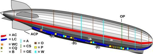 | Keywords: Zeppelin-LZ-127 internal.svg en Airship LZ 127 Graf Zeppelin drawing after model with some internal components Key ACP Auxiliary control post red AC axial corridor running from main ring -2 to the front mooring hub blue LC lower corridor running from main ring 20 to ring 211 ending at ladder to axial corridor orange WC crew's toilet beige CQ crew's quarters with tables chairs and berths beige B berths or cargo space blue stripes A ventilation shaft green stripes CS climbing shaft brown stripes GE exhaust gas shaft brown box O oil tanks yellow box P petrol tanks light blue box W water tank OP Observation post on top of hull Note this SVG file has two separate layers the model layer and the annotations layer own and Thyes 2007 Thyes original 84user annotations File Airship-Zeppelin-LZ-127 svg Original diagram File Zeppelin-LZ-127 internal and gas cells svg With internal structure and gas cells File Zeppelin-LZ-127 gas cells svg With internal gas cells File Zeppelin-LZ-127 internal opaque svg With internal structure slightly opaque File Zeppelin-LZ-127 internal and gas cells opaque svg With internal structure and gas cells slightly opaque thumb right 200px Thumbnail of this illustration at 200 pixels as rendered inside an article - Thyes AttribSVG Airship-Zeppelin-LZ-127 svg Thyes Created with Inkscape yes ValidSVG http //upload wikimedia org/wikipedia/commons/d/db/Zeppelin-LZ-127_internal svg LZ 127 Graf Zeppelin Language-neutral aviation diagrams Line drawings of airships SVG aircraft Cutaway diagrams of aircraft |