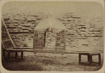 | Keywords: Zeravshan Okrug. Palanquins of Saint Musa Khan Preserved in the Mosque of Saint Makhdum Azam in the Village of Dakhbit WDL3897.png Artwork ru Богаевский иколай Владими ович 1843 1912 гг fr Bogaevskii Nikolaï V 1843-1912 en Bogaevskii Nikolai V 1843-1912 zh 亚历山大·L· ,1840-1888 年 pt Bogaevskii Nikolai V 1843-1912 ar بوغافسكي، نيكولاي ف ، 1843-1912 es Bogaevskii Nikolai V 1843-1912 ru Зе авшанский ок уг Паланкин святого усы-хана х анящийся в мечети святого ахдуми Азама в кишлаке Дагбит fr Okrug de Zeravchan Palanquins du vénérable Musa Khan conservés dans la mosquée du vénérable Makhdoum Azam dans le village de Dakhbit en Zeravshan Okrug Palanquins of Saint Musa Khan Preserved in the Mosque of Saint Makhdum Azam in the Village of Dakhbit zh 扎拉夫桑区 达克比特 麦赫 姆·阿扎姆清 寺中 存的 穆萨·汗的轿子 pt Okrug de Zeravshan Palanquim do santo Musa Khan preservado na mesquita de santo Mahdum Azam no povoado de Dakhbit ar زيرافشان أوكروج مِحَفَّة الوَلِيّ موسى خان المحفوظة بمسجد الوَلِيّ مخدوم عزَّام في بلدة دَخبيت ru Эта фотог афия паланкина носилок из мечети ахдуми Азама в кишлаке Дагбит Узбекистан соде жится в а хеологической части <em> Ту кестанского альбома </em> Шеститомное фотог афическое исследование было подготовлено и издано в 1871 1872 гг под пат онажем гене ала Константина П фон Кауфмана пе вого гене ал-губе нато а 1867 1882 гг Ту кестана как называли в то в емя те ито ию Цент альной Азии п инадлежавшую Российской импе ии Кишлак Дагбит находился на те ито ии Зе авшанского <em>ок уга</em> об азованного в составе Российской импе ии в 1868 г после того как оссийские войска заняли восточную часть Буха ского ханства сов еменный Узбекистан К концу 1868 г к ок угу была п исоединена те ито ия вок уг го ода Пенджикента Панджакента ныне находящегося на севе о-западе Таджикистана К 1871 г в ок уг были включены феодальные владения в ве ховьях еки Зе авшан п итока Амуда ьи С еди го одов асположенных на еке Зе авшан наиболее заметный след в исто ии оставил Сама канд Дагбит считается таджикским топонимом и относится к местности населенной узбеками и таджиками П едставленный на фотог афии паланкин п инадлежал почитаемому елигиозному лиде у усе-хану Паланкин п едставляет собой бесколесное с едство пе едвижения пе емещаемое людьми и в данном случае состоит из к ытой кабины с сиденьем и длинных шестов кото ые подде живались носильщиками <br>Д евности; Фотог афические исследования; Паланкины fr Cette photographie du palanquin chaise à porteurs dans la mosquée Makhdoum Azam située dans le village de Dakhbit Ouzbékistan est extraite de l ouvrage archéologique <em>Album du Turkestan</em> Cet inventaire photographique en six volumes fut réalisé entre 1871 et 1872 sous le patronage du général Konstantin P von Kaufman premier gouverneur général 1867-1882 du Turkestan nom donné aux territoires d'Asie centrale de l'Empire russe Le village de Dakhbit était situé dans le district <em>okrug</em> de Zeravchan qui devint partie intégrante de l Empire russe en 1868 lorsque les troupes russes occupèrent la partie orientale du khanat de Boukhara actuel Ouzbékistan Fin 1868 la zone autour de la ville de Pendjikent actuel Panjakent dans le nord du Tadjikistan a été annexée au district Dès 1871 le district avait absorbé des fiefs dans le cours supérieur du fleuve Zeravchan un affluent de l Amou-Daria Samarcande est la plus importante des villes historiques du Zeravchan « Dakhbit » est considéré comme un toponyme tadjik dans une région habitée par des populations ouzbek et tadjik Le palanquin montré ici appartint au chef religieux vénéré Musa Khan Il s agissait d un mode de déplacement sans roues à propulsion humaine constitué ici d une cabine fermée et de longues perches soulevées par des porteurs <br>Antiquités; Inventaires photographiques; Chaises à porteurs en This photograph of a palanquin sedan chair from the Makhdum Azam mosque in the village of Dakhbit Uzbekistan is from the archeological part of <em>Turkestan Album</em> The six-volume photographic survey was produced in 1871 72 under the patronage of General Konstantin P von Kaufman the first governor-general 1867 82 of Turkestan as the Russian Empire s Central Asian territories were called The village of Dakhbit was located in Zeravshan District <em>okrug</em> formed as part of the Russian Empire in 1868 when Russian troops occupied the eastern part of the Khanate of Bukhara in present-day Uzbekistan By the end of 1868 the area around the town of Pendzhikent Panjakent now in northwest Tajikistan was added to the district By 1871 the district absorbed fiefdoms in the upper r