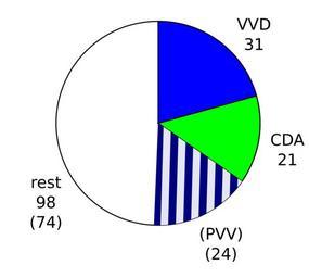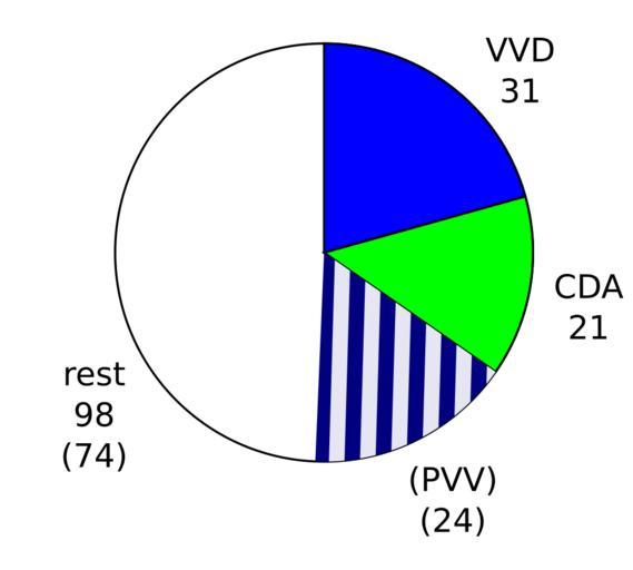 | Keywords: ZetelsRutte-metPVV.svg nl Taartdiagram aantal zetels Rutte met aandeel van gedoogpartij PVV gearceerd en Pie chart showing the number of seats in the House of Representatives held by parties in the Rutte Cabinet The blue hatched area represents the PVV which supports the government but isn't part of it Dutch version own Mtcv 2010-09-29 Version without PVV 200px Pie charts SVG pie charts Politics of the Netherlands Kabinetsformatie 2010 Nederland Cabinets of the Netherlands Cabinet Rutte |
