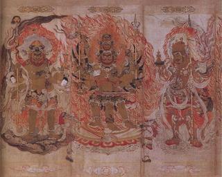 | Keywords: Zhang ShengWen-Dali Buddist Volume Section.jpg en Kingdom of Dali Buddhist Volume of Paintings portion Scroll Ink and color on paper 30 4 cm high Located in the National Palace Museum Taibei The entire work is 16 655 meters It was created in the Kingdom of Dali now Yunnan Province zh 大理 梵像 部分 - 卷 - 紙 設色 縱30 4厘米 全橫16 655米 立故宮博物院 Zhongguo gu dai shu hua jian ding zu 中国古代书画鑑定组 1997 Zhongguo hui hua quan ji 中国绘画全集 Zhongguo mei shu fen lei quan ji Beijing Wen wu chu ban she Volume 4 Creator Chang Sheng-wen 12th century - Completed by 1180 Chang Sheng-wen Paintings in the National Palace Museum Buddhist paintings from China Paintings of the Song Dynasty Kingdom of Dali PD-old-100 |