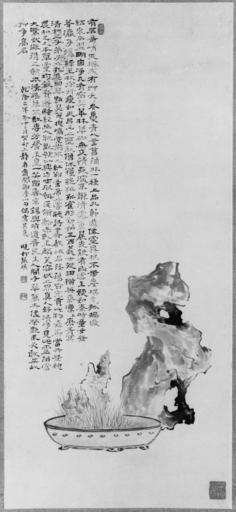 | Keywords: Zhangqi - Potted Calamus and Pleasure Rock - Walters 35209.jpg Some rocks are strange and eccentric formed by nature's cuts some grasses are young and tender green from winter to summer begins Zhangqi's Chang Ch'i's long poem The large rock and the planter must be imagined sitting before a clear window on an uncluttered desk The rest of the poem is devoted to the praise of the divine sprouts of the calamus growing in the planter Its leaves are hung over doorways at the time of the annual dragonboat festival and its dried rootlets have numerous medicinal uses The seals Zhangqi Chang Ch'i impressed upon his painting suggest something of his character They read Having no worldly desires and Mountain master of vegetable roots 1738 ink color paper W 14 13/16 x L 31 15/16 in 37 7 x 81 1 cm accession number 35 209 16284 Kaikodo New York date and mode of acquisition unknown Walters Art Museum 1996 by purchase Museum purchase 1996 Zhang Xiaocun Wanshi penchang tu Chang Hsiao-ts'un Wan-shih p'en-ch'ang T'u Picture of Calamus in Basin and Rock for Enjoyment by Zhang Xiaocun Chang Hsiao-ts'un Zhangqi Chang Ch'i ; Zhang Xiaocun penshi tu Chang Hsiao-ts'un P'en-shih T'u Picture of Basin by Zhang Xiaocun Chang Hsiao-ts'un Zhangqi Chang Ch'i ; Caiken shanzhang Ts'ai-ken shan-chang Mountain Master of Vegetable Roots ; Liyuan Zhongye she shoucang yinji Li-yüan chung-yeh shih shou-ts'ang yin-chi Collecting seal of Liyuan Zhengye Li-yüan chung-yieh ; Signature Xiaocun Hsiao Ts'un; Signature Zhangqi Tanbai Chang Ch'i Tan-pai or Tanbo Tan-po - Having no worldly desires place of origin China Walters Art Museum license 2D Chinese paintings in the Walters Art Museum Zhangqi Media contributed by the Walters Art Museum needs category review |