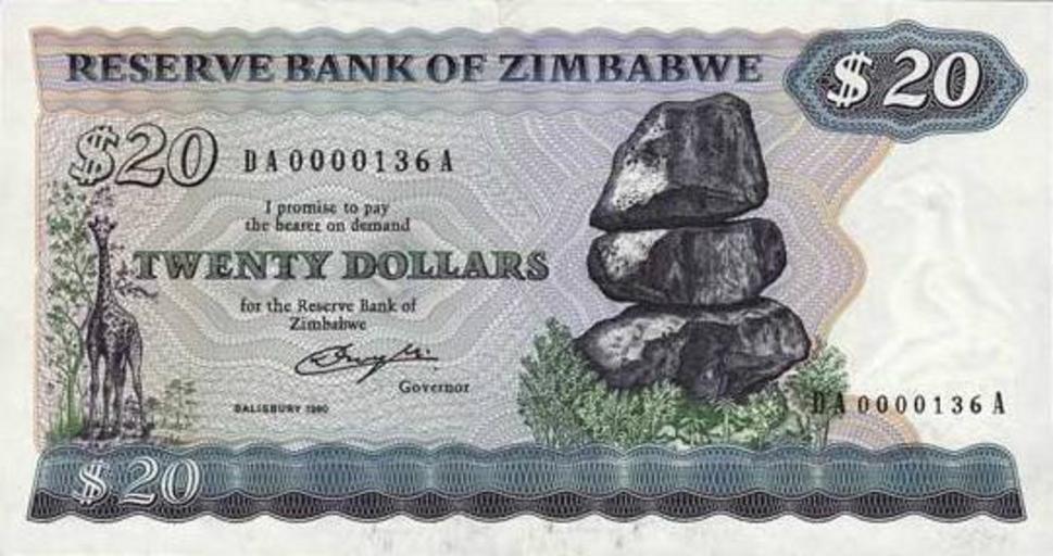 | Keywords: Zimbabwe $20 1980 Obverse.jpg This is an image of the front of the paper Zimbabwe dollar which circulated from 1980 and 1982 en wikipedia 2008-10-02 Mangwanani wikipedia en PD-ZW-currency original upload log page en wikipedia Zimbabwe_ 2420_1980_Obverse jpg 2008-10-02 16 16 Mangwanani 550×294× 36853 bytes <nowiki> Summary This is an image of the front of the paper Zimbabwe dollar which circulated from 1980 and 1982 Use of this image in article Banknotes of the Reserve Bank of Zimbabwe is believed to be fair use because It adds </nowiki> Banknotes of Zimbabwe 1980-1994 Giraffes on banknotes Banknotes with a face value of 20 Grey banknotes of Zimbabwe |