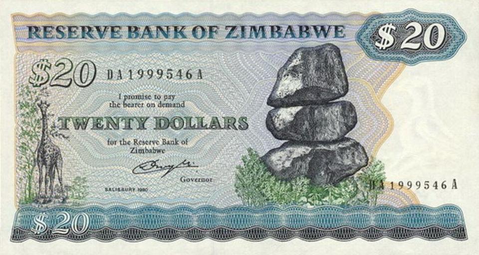 | Keywords: Zimbabwe $20 1983 Obverse.jpg This is an image of the front of the paper Zimbabwe dollar which circulated from 1980 and 1982 Transferred from http //en wikipedia org en wikipedia 2008-10-02 Original uploader was Mangwanani at http //en wikipedia org en wikipedia PD-ZW-CURRENCY PD-ZW-currency original upload log page en wikipedia Zimbabwe_ 2420_1983_Obverse jpg 2008-10-02 16 36 Mangwanani 550×299× 36397 bytes <nowiki> Summary This is an image of the front of the paper Zimbabwe dollar which circulated from 1980 and 1982 Use of this image in article Banknotes of the Reserve Bank of Zimbabwe is believed to be fair use because It adds </nowiki> Banknotes of Zimbabwe 1980-1994 Giraffes on banknotes Banknotes with a face value of 20 Blue banknotes of Zimbabwe |