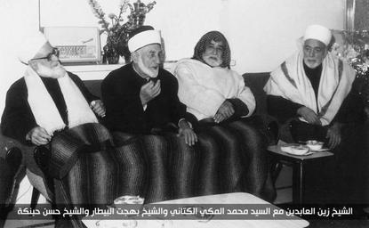 | Keywords: Zine El Abidine Ben Hasine Ettunsi in a meeting.jpg en Zine El Abidine Ben Hasine Ettunsi with Muhamed Elmakki Alkatani and Sheikh Bahjat Albaytari and Sheikh Hasan Habanka fr Zine El Abidine Ben Hasine Ettunsi avec Mohamed Elmakki Alkatani et Cheikh Bahjat Albaytari et Cheikh Hasan Habanka ar الشيخ زين العابدين مع السيد محمد المكي الكتاني والشيخ بهجت البيطار والشيخ حسن حبنكة http //www zein-tounsi com/Memory html Author between 1888 1977 PD-Tunisia Zine El Abidine Ben Hasine Ettunsi | ||||