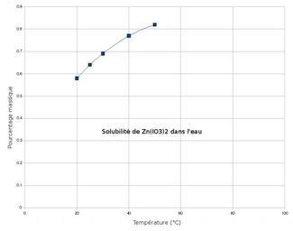 Keywords: Zn(IO3)2 Solubilite dans eau.png fr Solubilité de l'iodate de zinc dans l'eau Créée par mes soins avec OpenOffice org Calc et The Gimp d'après http //www hbcpnetbase com/ Handbook of Chemistry Physics Epop Zinc compounds Iodates