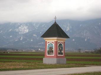 Keywords: Znamenje-LuzeGorenjska1.jpg Luže Gorenjska Slovenia own 2008-03 Sl-Ziga Šenčur municipality Wayside shrines in Slovenia Pyramid roofs in Slovenia Fog in Slovenia