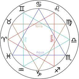 Keywords: ZodiacTrigons.svg en Zodiac with element trigons red fire brown earth cyan air blue water and Latin lettering Sun moving clockwise Aries on the left own WolfgangRieger 2010-09-30 Zodiac aspects