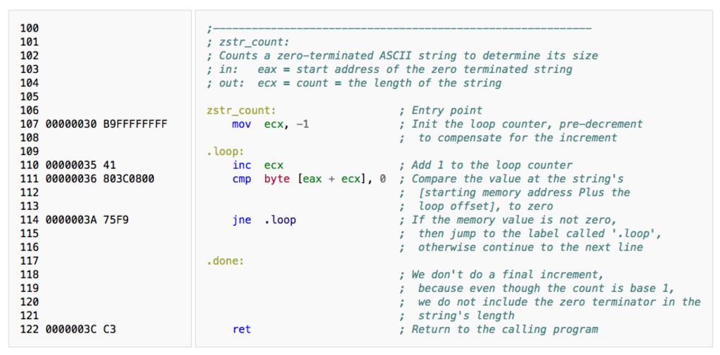 Keywords: Zstr count x86 assembly.png Uploaded with en wp UW marker 2016 01 19 zstr_count function that implemented using x86 assembly https //en wikipedia org/w/index php title Assembly_language action edit section 20 2016-01-19 OldCodger2 Original source code text <source lang objdump line start 100 > 00000030 B9FFFFFFFF 00000035 41 00000036 803C0800 0000003A 75F9 0000003C C3 </source> <source lang nasm > ;----------------------------------------------------------- ; zstr_count ; Counts a zero-terminated ASCII string to determine its size ; in eax start address of the zero terminated string ; out ecx count the length of the string zstr_count ; Entry point mov ecx -1 ; Init the loop counter pre-decrement ; to compensate for the increment loop inc ecx ; Add 1 to the loop counter cmp byte eax + ecx 0 ; Compare the value at the string's ; starting memory address Plus the ; loop offset to zero jne loop ; If the memory value is not zero ; then jump to the label called ' loop' ; otherwise continue to the next line done ; We don't do a final increment ; because even though the count is base 1 ; we do not include the zero terminator in the ; string's length ret ; Return to the calling program </source> OldCodger2 |