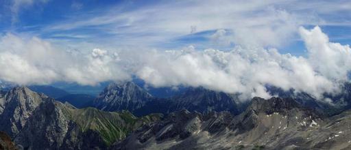 Keywords: zugspitze mountain panorama clouds cloud band sky blue highest mountains germany panorama very high mountain sun summer holiday leisure family holiday destination