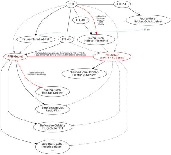 | Keywords: Zum Akronym FFH und begrifflichen Ableitungen, sowie einer Auswahl an Deutungen.svg de Zum Akronym FFH und seinen begrifflichen Ableitungen sowie einer Auswahl an Deutungen Diese Grafik dient der Bestimmung eines geeigneten Lemmas für Fauna-Flora-Habitate die durch eine administrative Verwaltungseinheit unter Schutz gestellt wurden Sie zeigt auf anschauliche Weise weshalb fachliche Umgangssprache nicht ohne Bedacht in das Schriftbild der Wikipedia kopiert und Akronyme innerhalb eines Lemmas einer Allgemein-Enzyklopädie gemieden werden sollten es sei denn sie dienen der Begriffsklärung 2014-08-05 22 46 37 own Cmuelle8 cc-zero Source <syntaxhighlight lang dot > digraph FFH node fontname Sans ; edge fontname Sans fontsize 9 ; FFH_exp label Fauna-Flora-Habitat ; FFH-RL_exp label Fauna-Flora-\nHabitat-Richtlinie ; FFH-SG_exp label Fauna-Flora-\nHabitat-Schutzgebiet ; FFH -> FFH_exp n; FFH-RL -> FFH-RL_exp ; FFH-SG -> FFH-SG_exp ; FFH-G_mix color darkred label FFH-Gebiet fontcolor darkred ; FFH-RL-G_mix color darkred label FFH-Gebiet\n bzw FFH-RL-Gebiet fontcolor darkred fontsize 12; FFH-G_exp label \ Fauna-Flora-\nHabitat-Gebiet\ ; FFH-RL-G_exp label \ Fauna-Flora-Habitat-\nRichtlinie-Gebiet\ ; FFH -> FFH-G_mix color gray style dashed ; FFH-G -> FFH-G_mix ; FFH_exp -> FFH-G_mix color gray style dashed ; FFH-G_mix -> FFH-G_exp color red label pleonastisch ein\nHabitat ist ein Gebiet ; FFH -> FFH-RL-G_mix color gray style dashed ; FFH-G -> FFH-RL-G_mix color gray style dashed ; FFH-RL_exp -> FFH-RL-G_mix color gray style dashed ; FFH-RL-G_mix -> FFH-RL-G_exp ; FFH -> FFH-RL dir none ; FFH -> FFH-G dir none ; FFH -> FFH-SG dir none ; FFH -> FFH-RL_exp color red label verkürzende\nUmgangs-\nsprache \nnicht\nintuitiv decorate true ; FFH-G_mix -> FFH-RL-G_mix dir none color red label Mehrdeutigkeit wegen ugs Gleichsetzung FFH u FFH-RL\n+ zus Unklarheit durch Deutungen FFH abseits der Biologie ; FFH-SG_exp s -> FFH_exp ne constraint false color lightblue label ist ein ; // FFH-G_mix -> FFH_exp constraint false color lightblue label ist ein ; // FFH-RL-G_mix -> FFH_exp constraint false color lightblue label ist ein ; node group A ; A1 label Empfangsgebiet\nRadio FFH ; A2 label Beflogene Gebiete\nFlugschule FFH ; A3 label Gebiete i Zshg \nFeldflugplätze \n ; FFH-G_mix -> A1; FFH-G_mix -> A2; FFH-G_mix -> A3; FFH-RL-G_mix -> A1 color gray style dashed ; FFH-RL-G_mix -> A2 color gray style dashed ; FFH-RL-G_mix -> A3 color gray style dashed ; FFH_exp -> FFH-G_exp -> FFH-RL_exp style invis ; FFH-RL-G_exp -> FFH-G_exp style invis ; FFH-G_exp -> A1 -> A2 -> A3 style invis ; FFH-RL -> FFH-SG style invis ; rank 1; rank same; FFH FFH-SG rank 2; FFH-RL rank 3; rank same; FFH_exp FFH-RL_exp rank 4; rank same; FFH-G_mix FFH-RL-G_mix </syntaxhighlight> Uploaded with UploadWizard Special Areas of Conservation in Germany Graphviz |