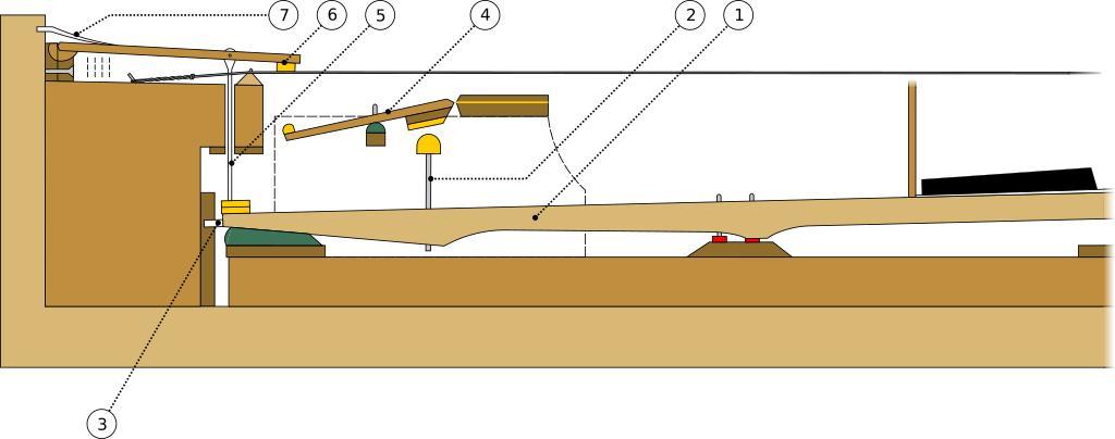 | Keywords: Zumpe english single square action.svg Zumpe's or Masons action drawn from the instrument of 1766 traced and colorized by Mireut from figure 6 page 715 George Grove ed A Dictionary of Music and Musicians vol 2 MacMillan and Co London 1880 http //www archive org/details/musicians02grovuoft 1880 A J Hipkins key 1 <br />jack a wire with leather stud on top known by the workmen as the 'old man's head' 2 <br />whalebone rear guide projects from the end of the key works in a groove to keep the key steady 3 <br />hammer 4 <br />whalebone jack called the 'mopstick' 5 <br />damper 6 <br />whalebone damper spring 7 PD-old Musical instruments schemes Musical instruments technical diagrams Piano action Square pianos Diagrams labelled with numbers only SVG music |