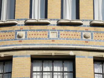 | Keywords: Zurenborg Dolfijnstraat 55-57-59 (13).JPG fr Anvers Belgique Quartier Zurenborg Ensemble de trois maisons sises Dolfijnstraat n° 55 maison de gauche 57 maison du milieu et 59 maison de droite de style Ă©clectique teintĂ© pour les deux maisons latĂ©rales de mauresque et d ™art nouveau lequel ensemble fait partie en rĂ©alitĂ© d ™un ensemble concertĂ© plus vaste comprenant en outre les n° 19 et 21 de la Schorpioenstraat et les n° 51 et 53 de la Dolfijnstraat conçu par l ™architecte Joseph Bascourt en 1897 Photo maison centrale n° 57 gros plan sur la façade Zurenborg deel uitmakend van een grotere groepsbebouwing welke omvat de nrs 19 en 21 van de Schorpioenstraat en nrs 51 en 53 van de Dolfijnstraat ontworpen door architect Jos Bascourt in 1897 In beeld middelste huis nr 57 detail gevel <br/> Vgl http //inventaris vioe be/dibe/relict/6735 Inventaris Bouwkundig Erfgoed geheel http //inventaris vioe be/dibe/relict/6736 Inventaris Bouwkundig Erfgoed nrs 55 en 59 en http //inventaris vioe be/dibe/relict/6737 Inventaris Bouwkundig Erfgoed middelste huis nr 57 self-photographed Torsade de Pointes 2010-06 Dolfijnstraat 55-57-59 Antwerp |