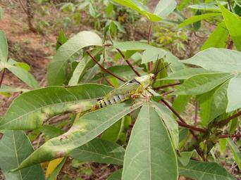 | Keywords: ZVA female.jpg en Female of the variegated grasshopper or stink locust Zonocerus variegatus photographed on 16/02/05 on a cassava plant at the Biological Control Centre for Africa International Institute of Tropical Agriculture in Cotonou Benin by Christiaan Kooyman The females are almost always brachypterous with short wings The ovipositor can be clearly seen at the tip of the abdomen own 2005-02-16 Christiaan Kooyman Zonocerus variegatus Ovipositor Insects of Benin Manihot esculenta leaves |